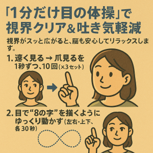 対策②:「1分だけ目の体操」で視界クリア&吐き気軽減→即効性をお求めならコレ!