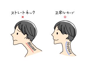 本来は緩やかなカーブを描いているはずの首の骨(頚椎)が、前かがみ姿勢のクセによって真っ直ぐに近づいてしまった状態です。